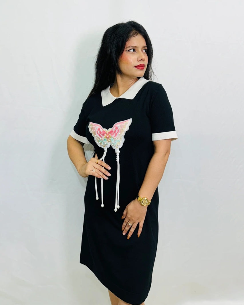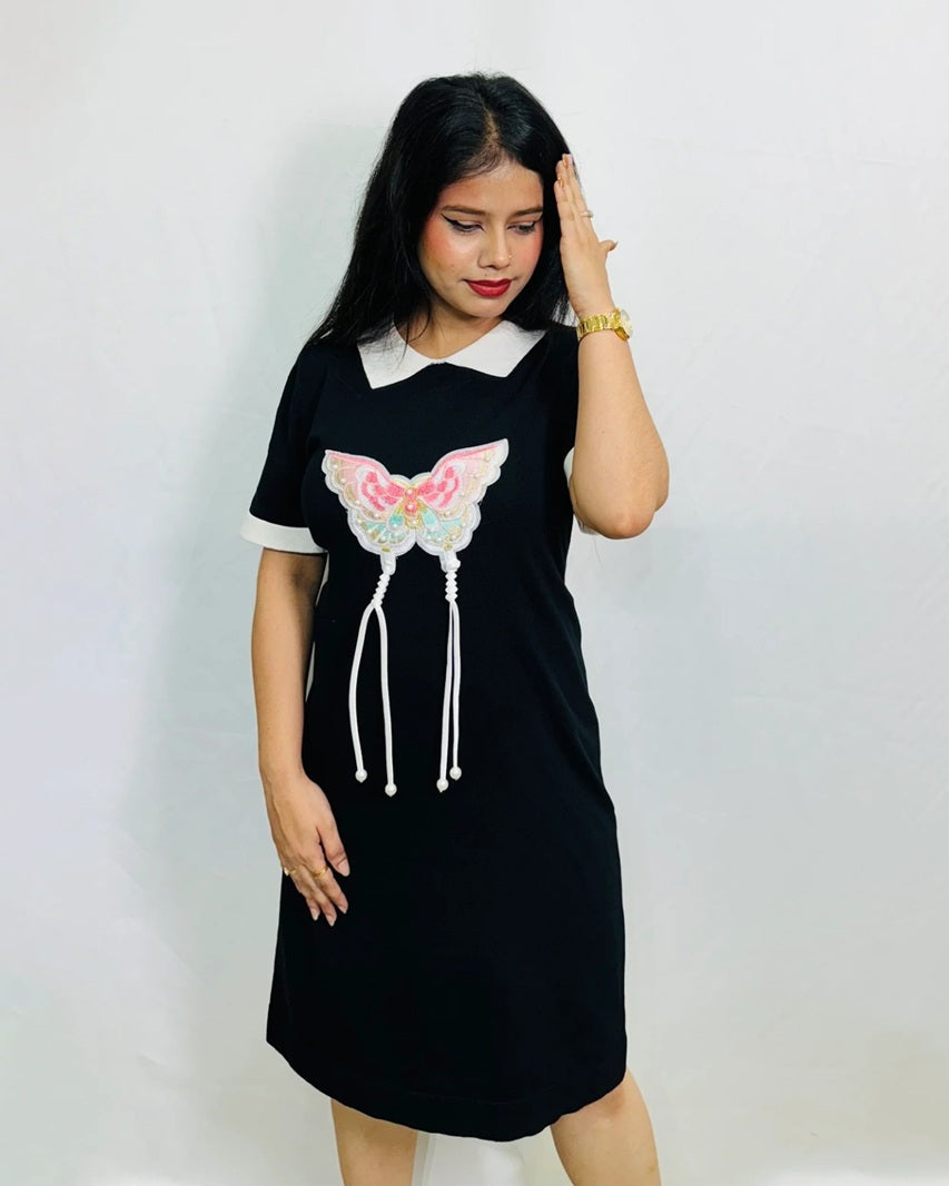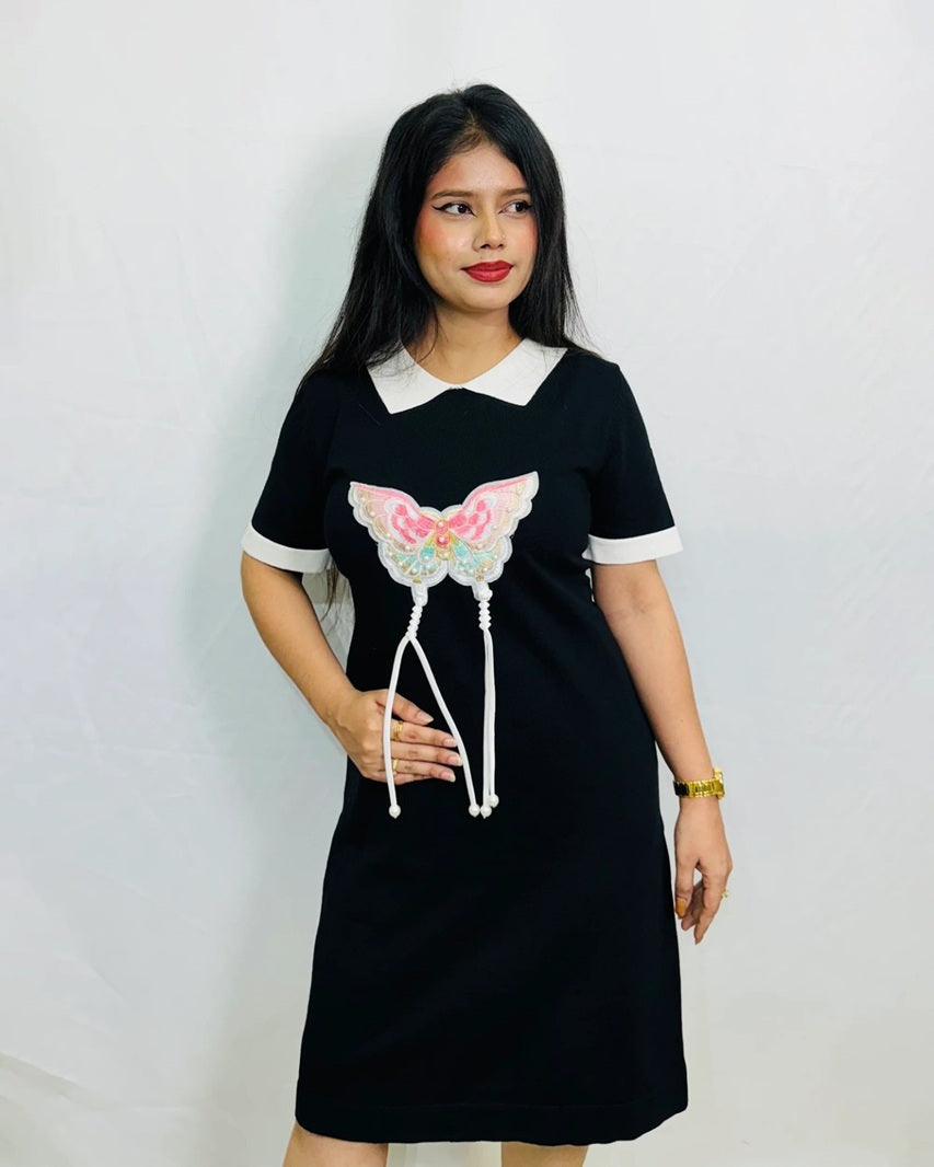 dd a touch of playful elegance to your wardrobe with this Black A-Line Dress featuring a beautifully embroidered butterfly applique at the front. The dress is crafted from a soft and breathable fabric that drapes perfectly for a flattering silhouette. The white Peter Pan collar and sleeve cuffs add a classic contrast, giving it a sophisticated and cute vibe.