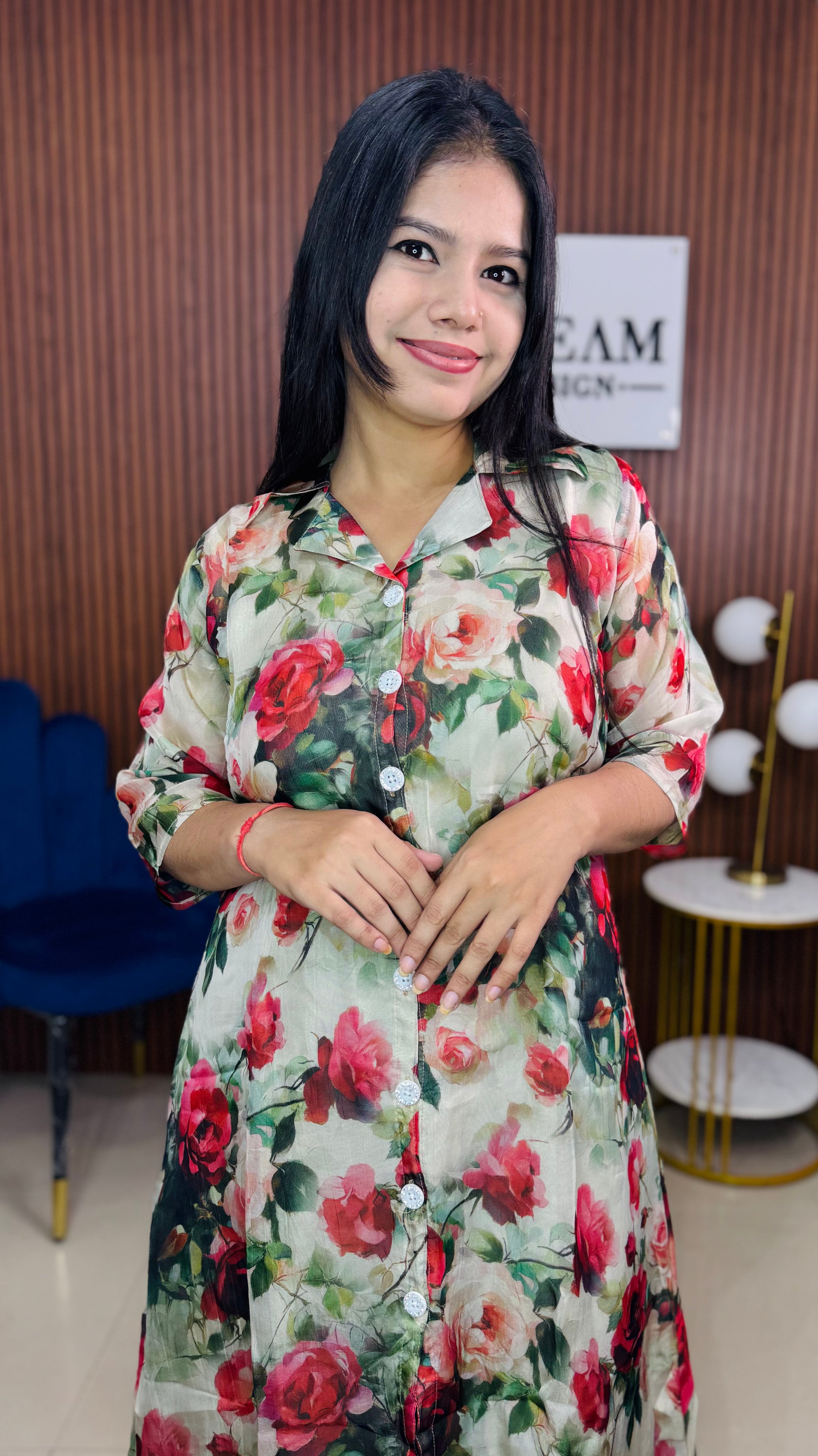 Add a touch of charm and elegance to your wardrobe with this floral printed co-ord set from Dream Design. Crafted from soft, lightweight fabric, this set features a button-down asymmetrical kurta with vibrant rose prints, paired perfectly with solid matching pants for a refined, balanced look.