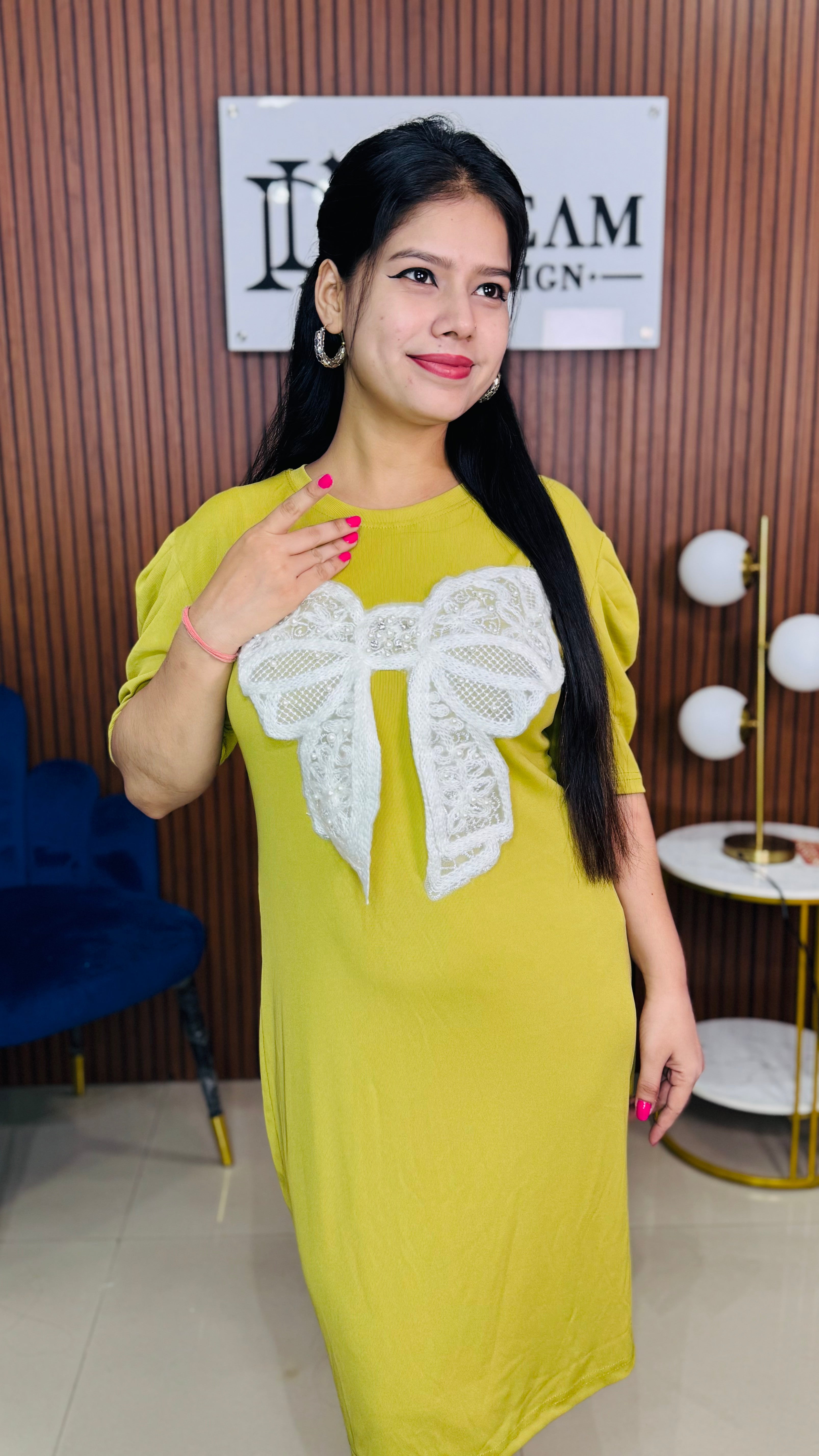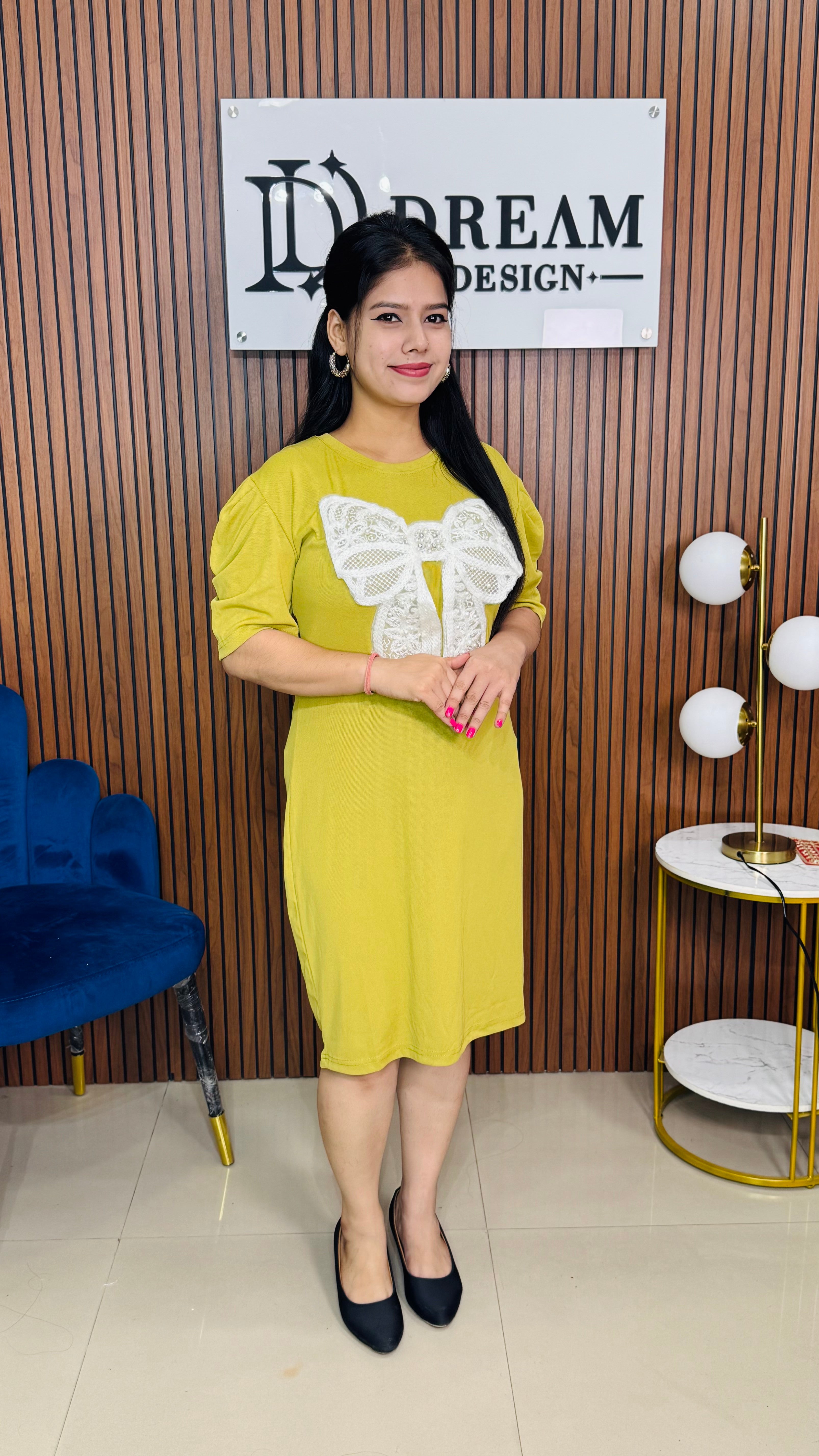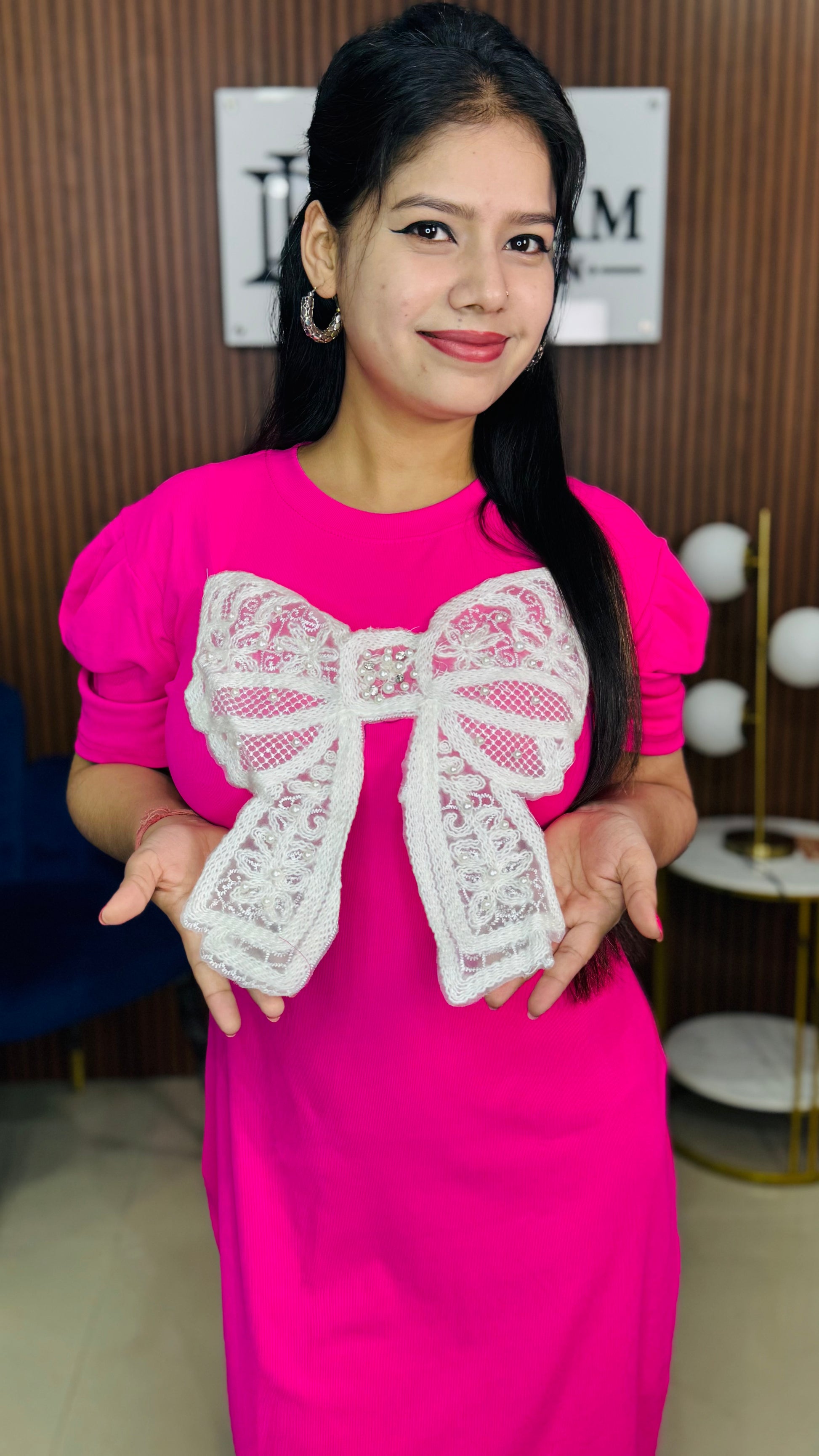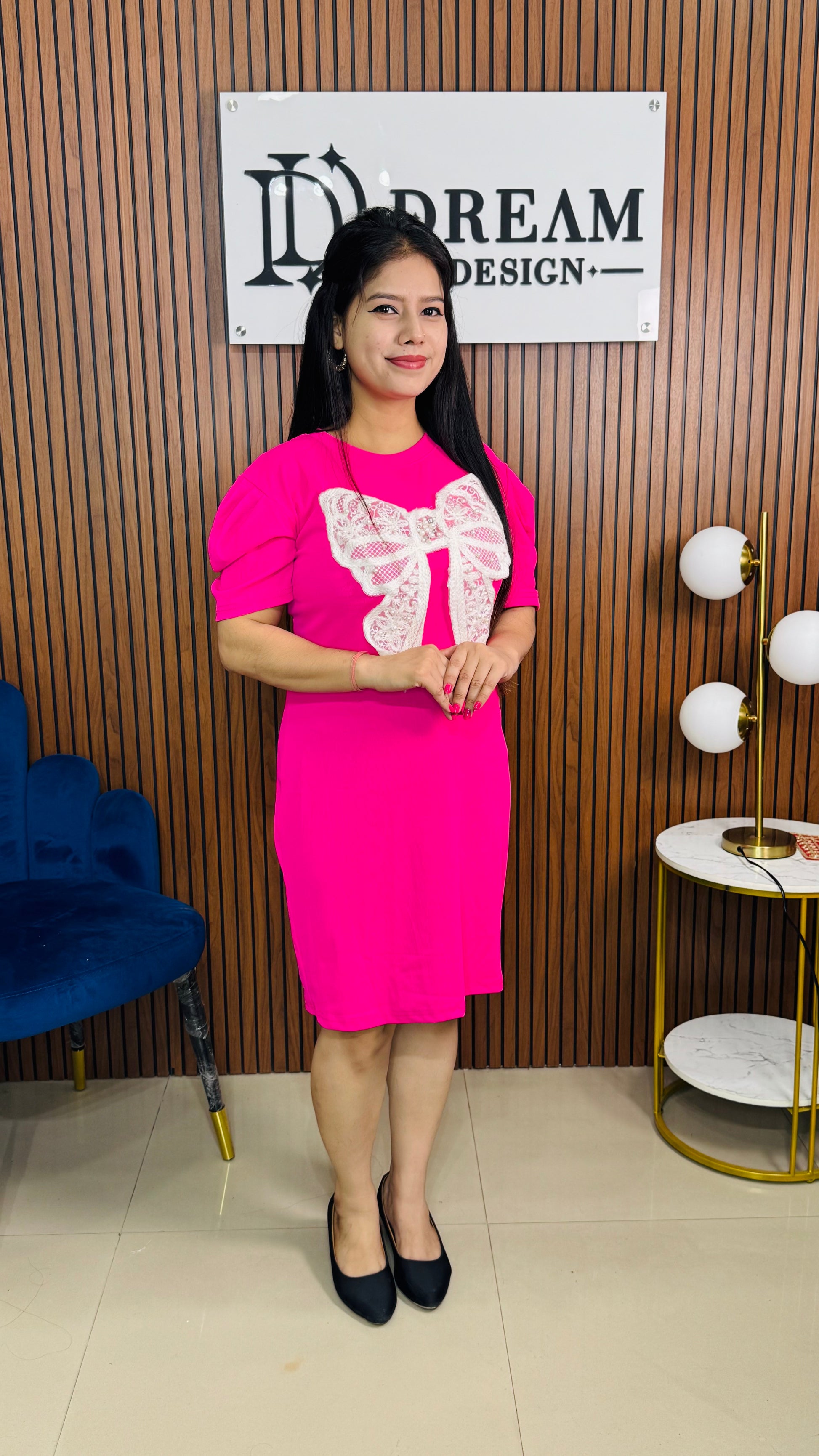 Step into style with this vibrant pink dress featuring a stunning lace bow detail on the front. Crafted for a perfect blend of comfort and chic, this knee-length dress is designed with subtle puffed sleeves to add a touch of sophistication. Ideal for casual outings, office wear, or semi-formal events, it offers a flattering fit that enhances your silhouette effortlessly. Pair it with your favorite heels or flats for a versatile look that’s both playful and elegant.