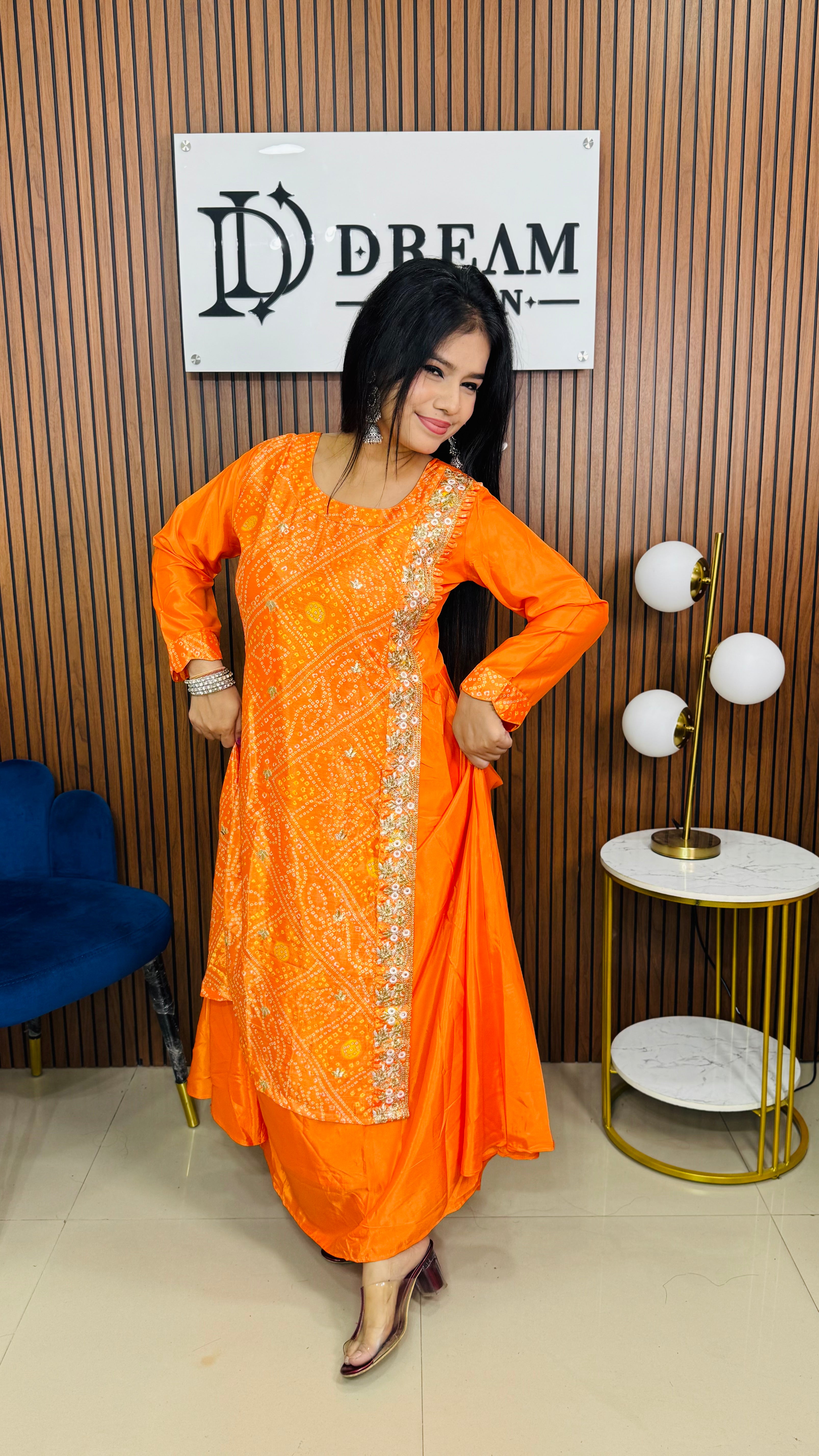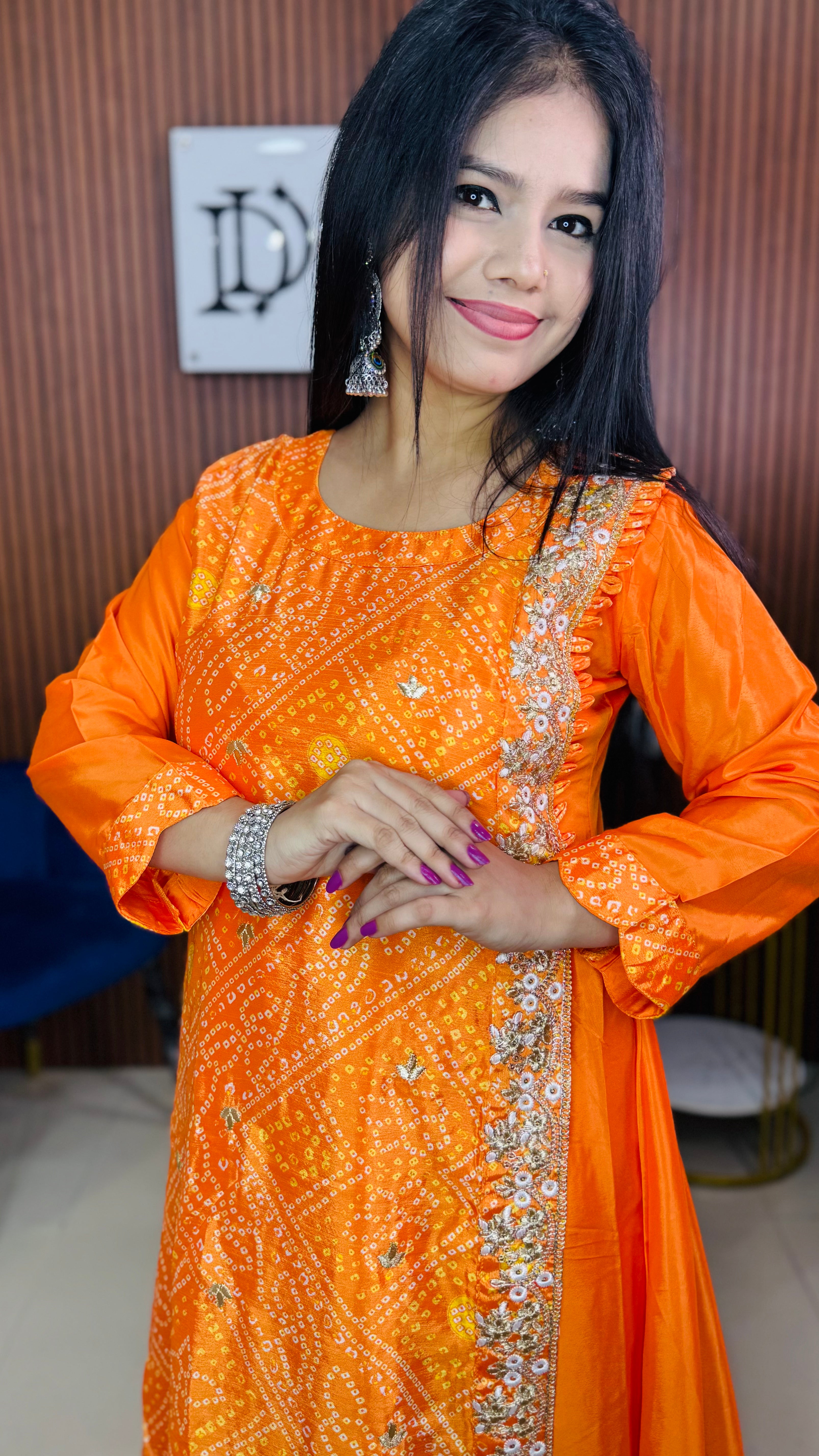 Bring festive charm to your wardrobe with this Bandhani Print Anarkali one piece with Embroidered Border, crafted in a rich, vibrant shade that exudes elegance. The kurta features delicate embroidery with mirror work detailing, adding a graceful sparkle, while the flowy palazzo enhances both comfort and style.
