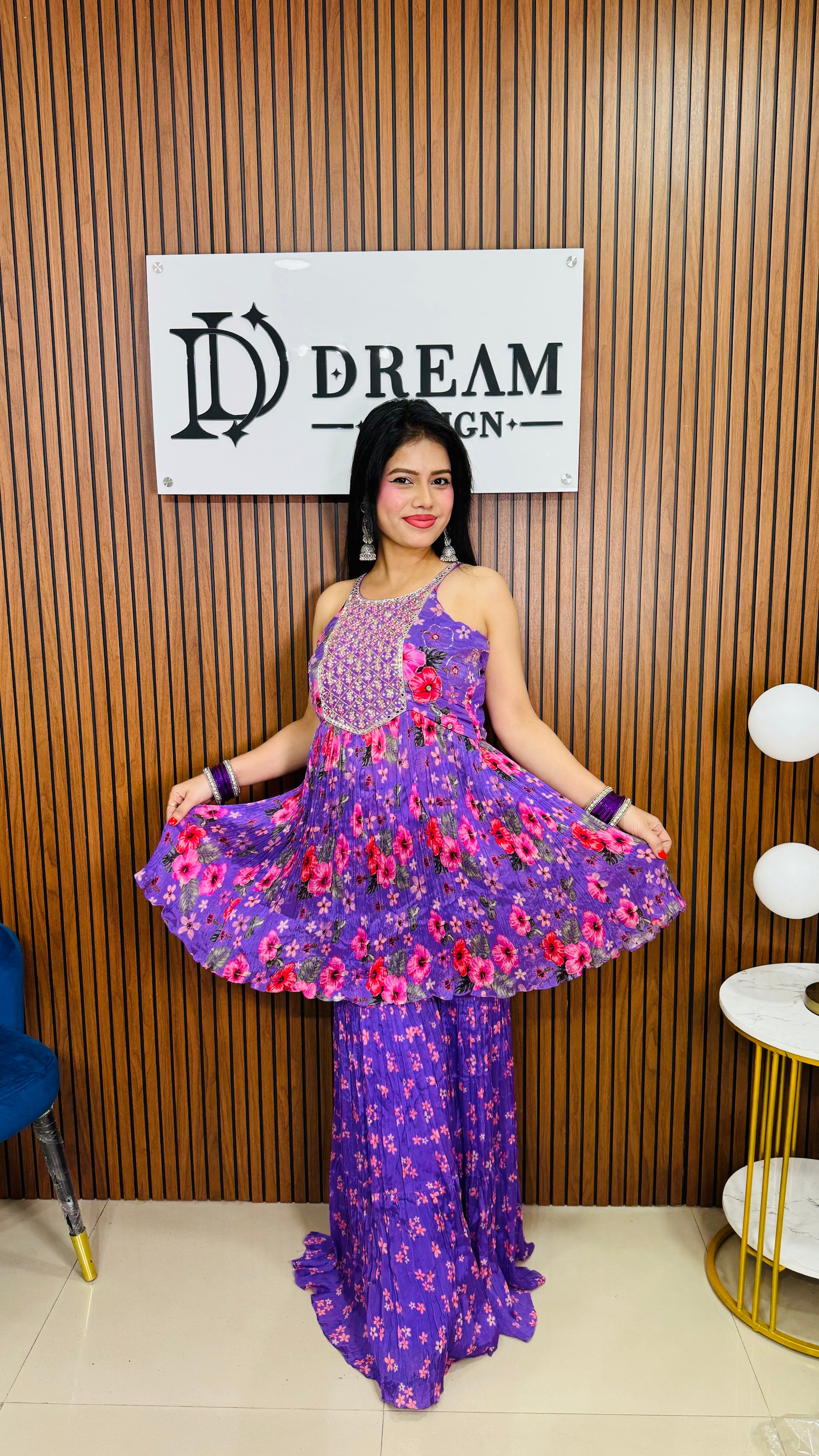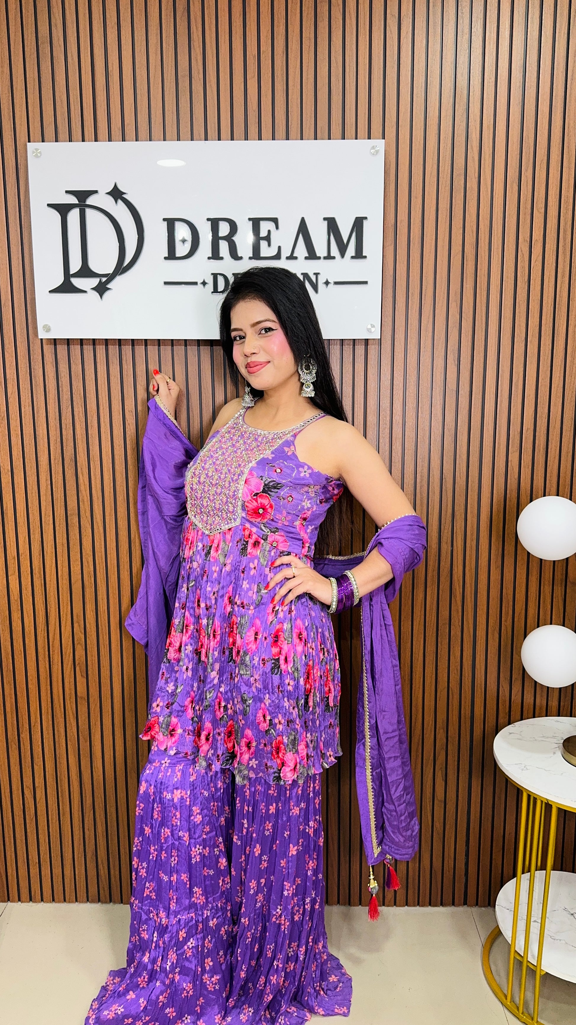 Bring your festive & wedding dreams to life in this stunning purple floral sharara suit, a perfect blend of traditional aesthetics and contemporary charm. The sleeveless short kurti features a beautifully hand-embroidered yoke with mirror and thread work, adding a rich, regal touch to the breezy floral base.