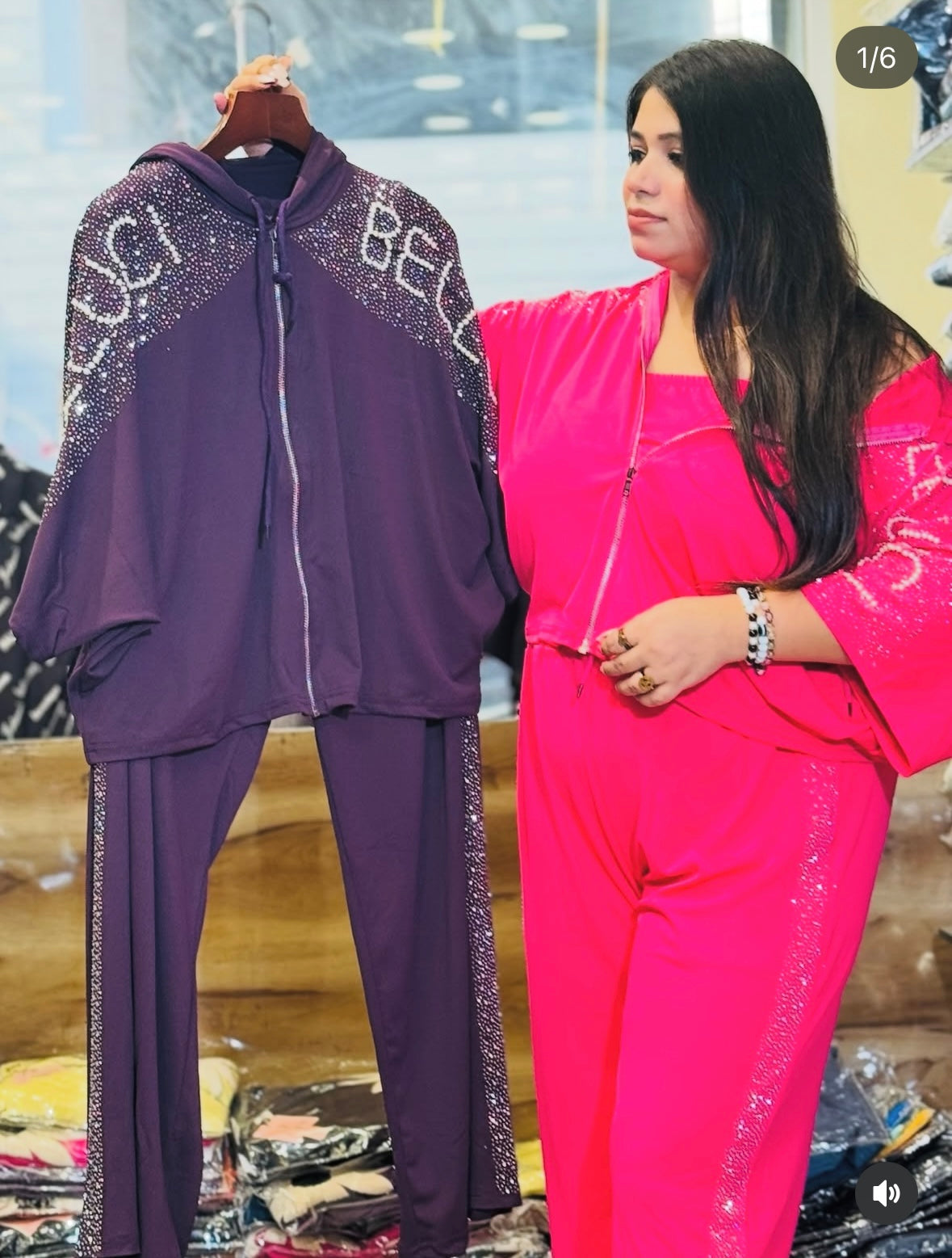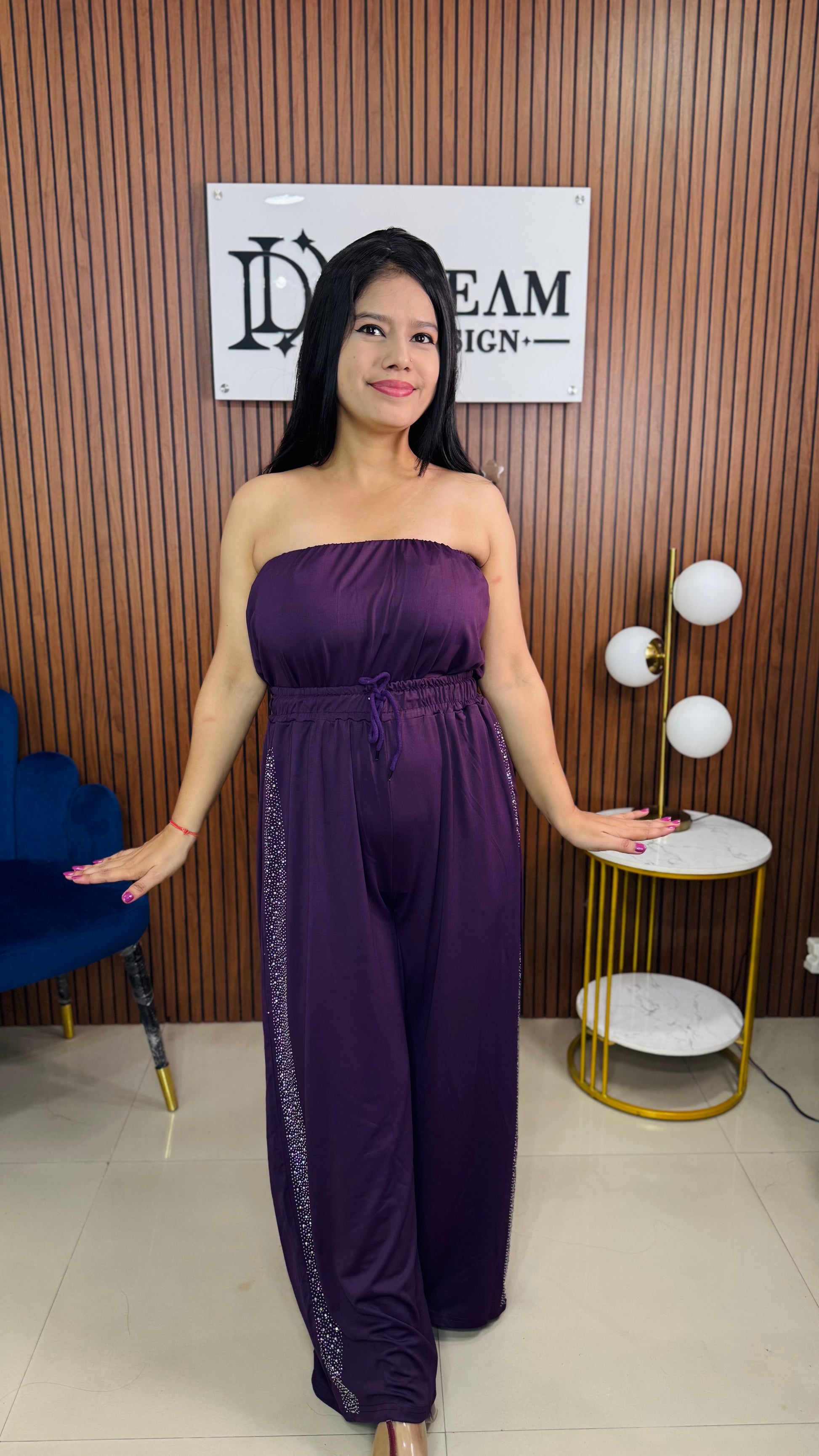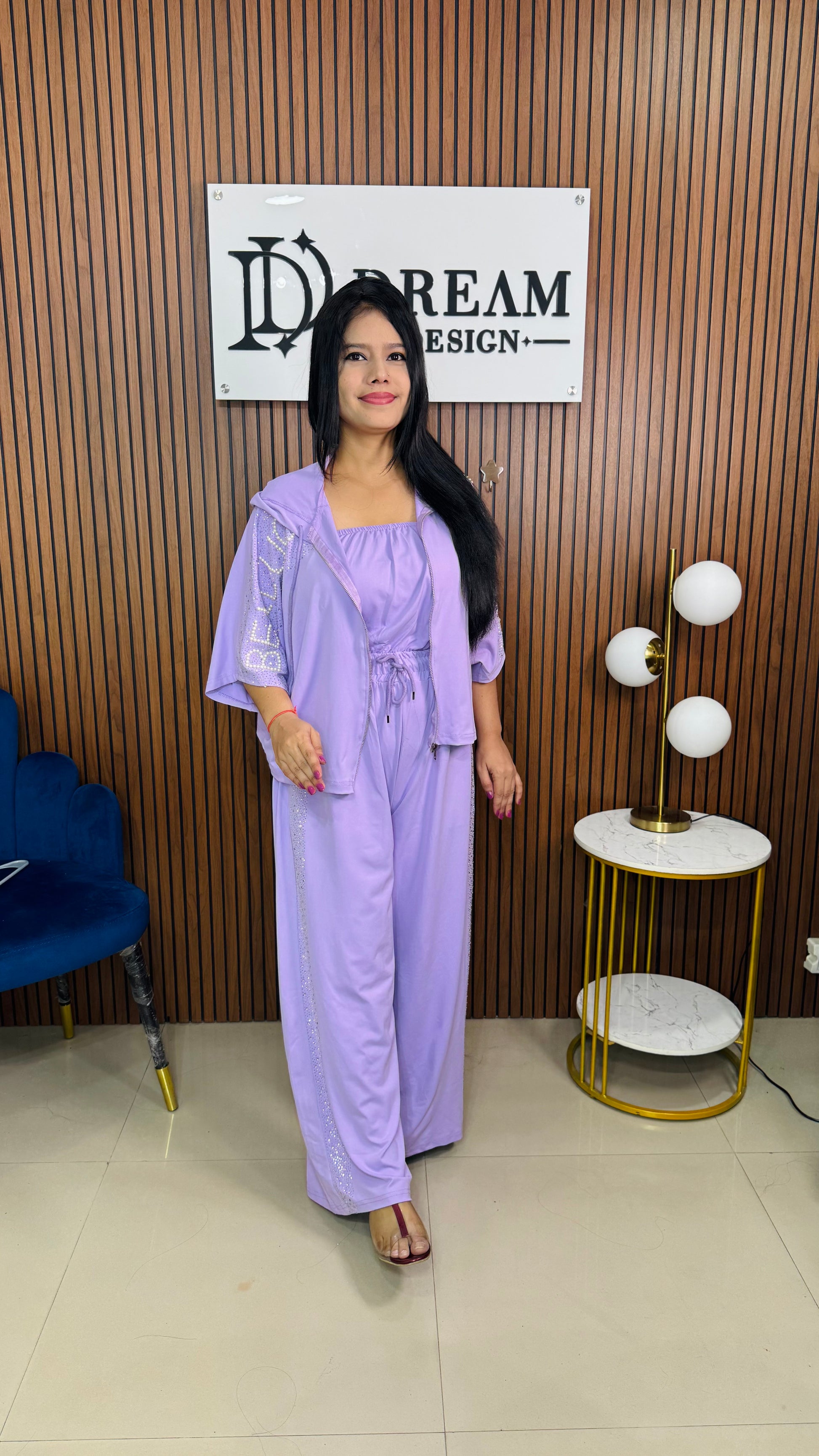 Make a bold fashion statement with this head-turning 3-piece co-ord set, designed for the modern fashionista who loves a blend of glam and comfort. This set features a trendy tube top, a sparkling embellished zip-up jacket, and matching relaxed-fit pants with side crystal detailing — giving you an effortlessly chic and coordinated look.