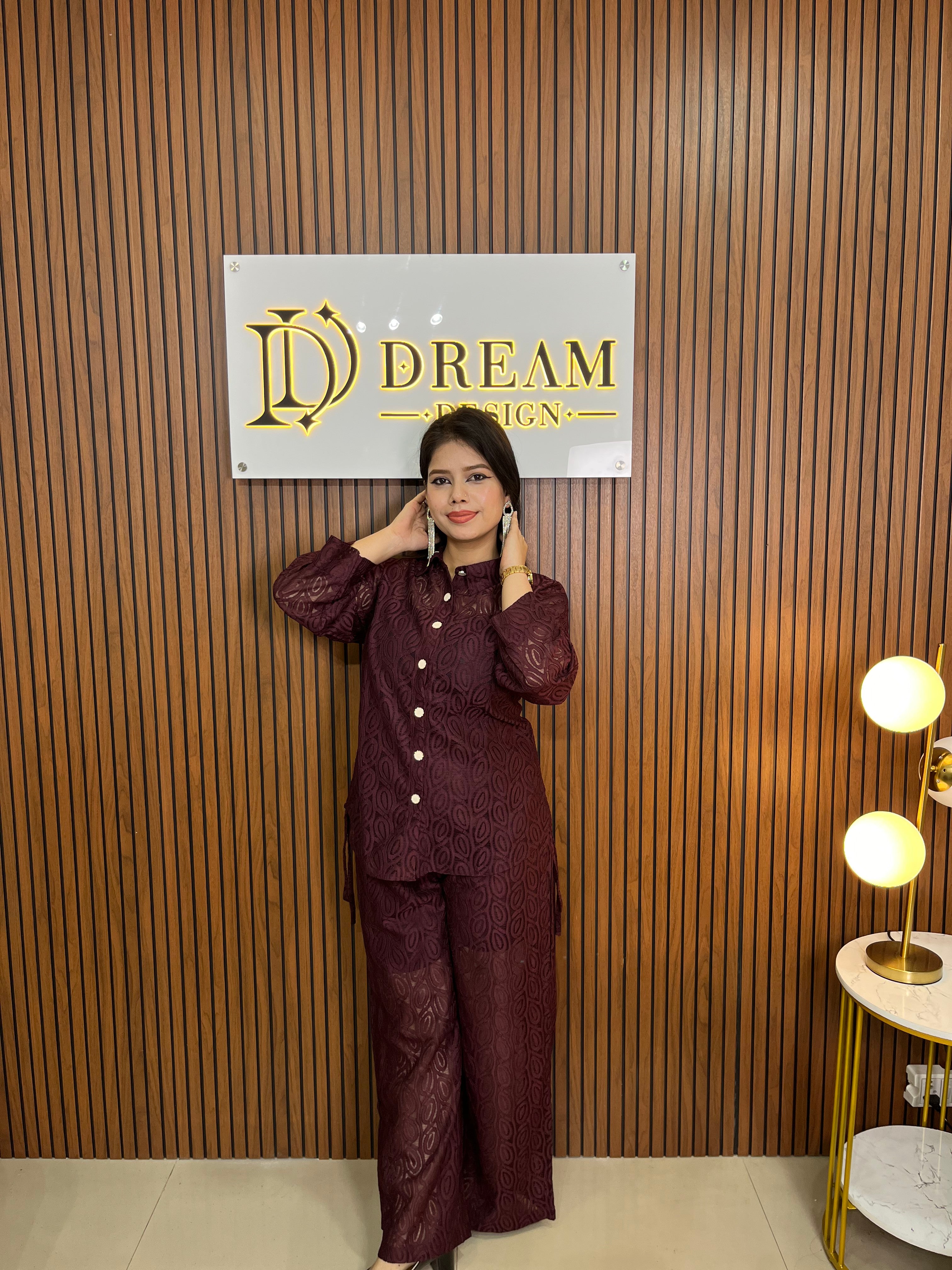 Crochet Leaf Pattern Collar Neck Co-ord Set that speaks volumes with its subtle detailing. Crafted from a sheer textured fabric with a unique self-design pattern, this set features a button-down shirt with statement pearl buttons and full-length sleeves. The matching wide-leg trousers offer both comfort and sophistication, making it the perfect ensemble for everything from dinner parties to chic evening outings.