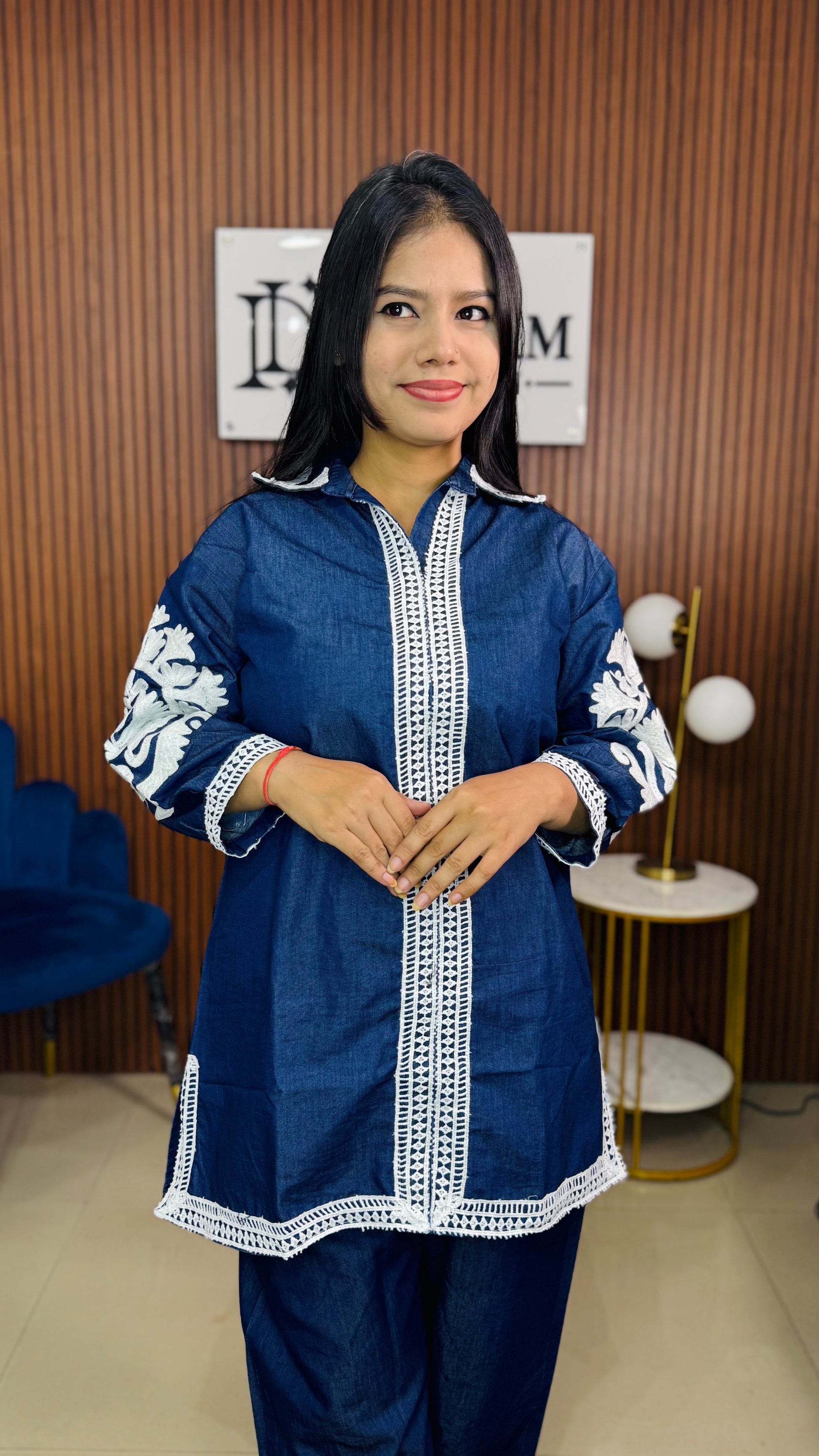 Elevate your everyday style with this denim-look embroidered co-ord set from Dream Design. Designed for modern women who love comfort with elegance, this set features a stylish shirt-style top adorned with intricate white thread embroidery and matching straight-fit pants for a sleek and polished look.